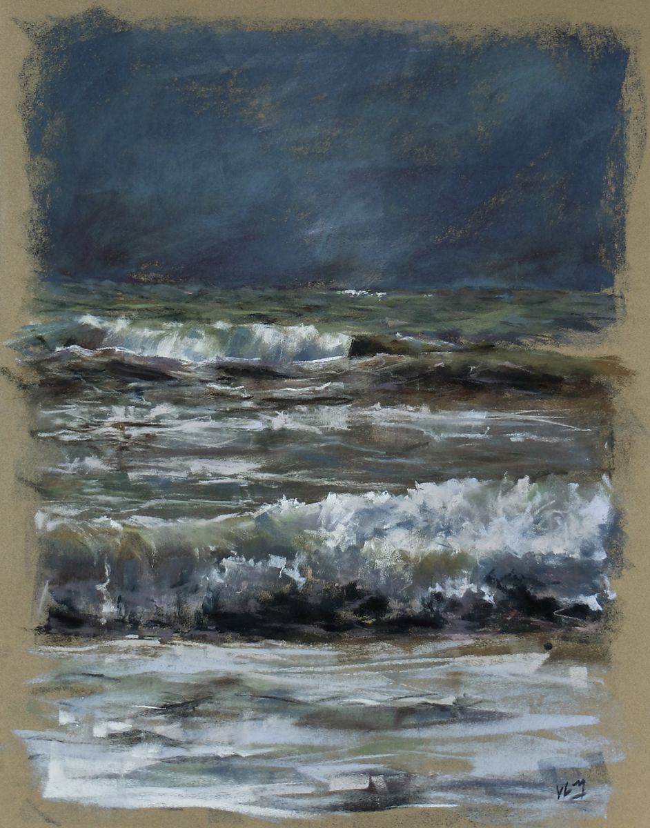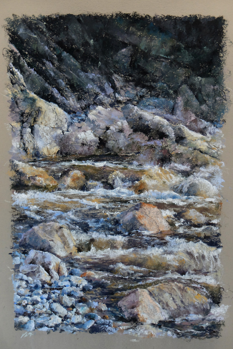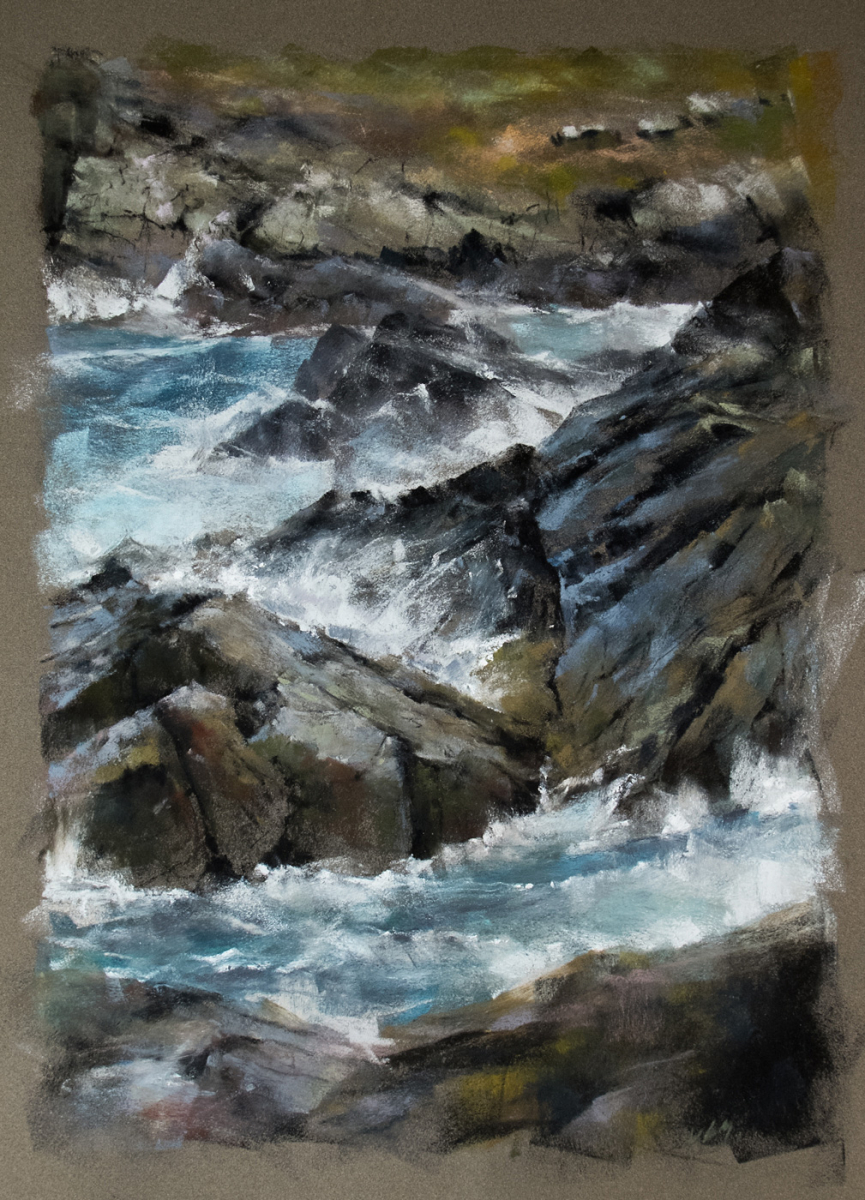 Mouvements d'eau au pied de la roche, léger ressac. Pastel - 35cm x 45cm © Valérie Le Merrer