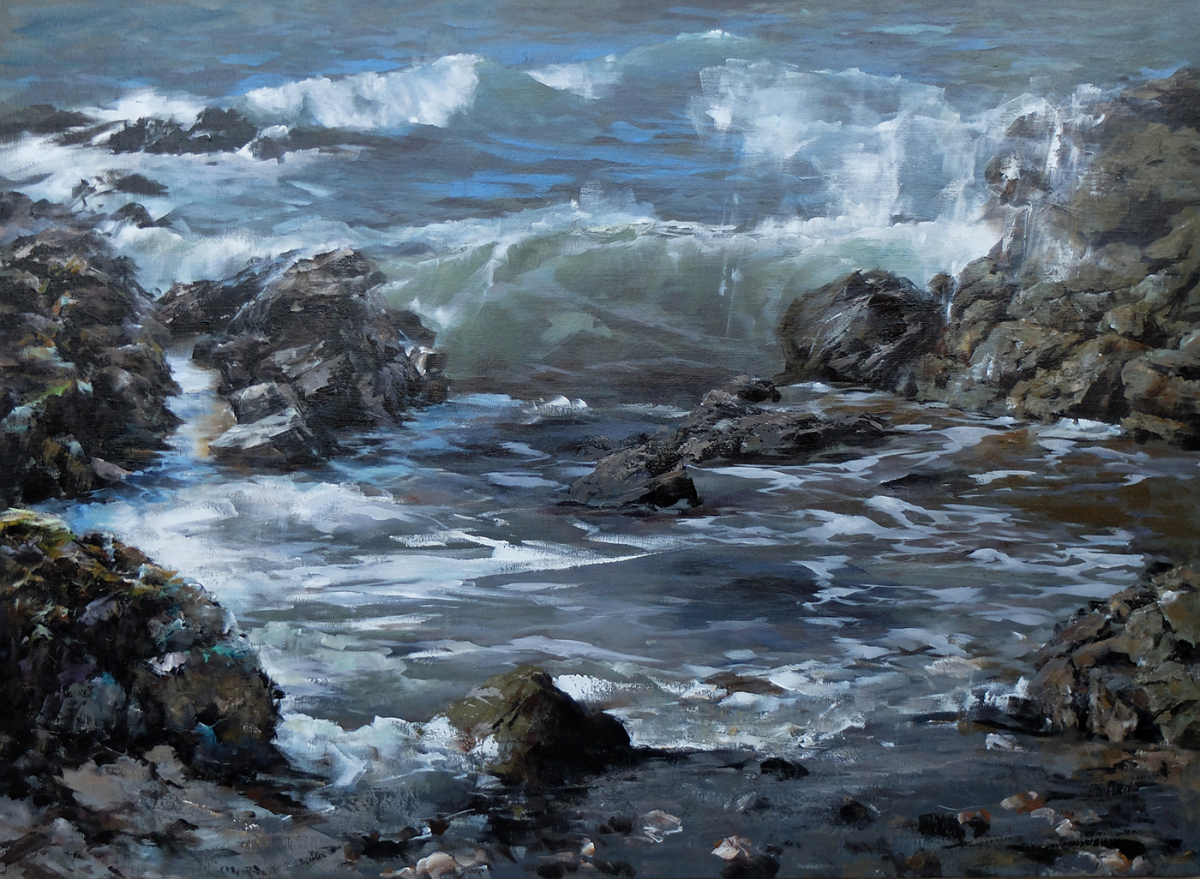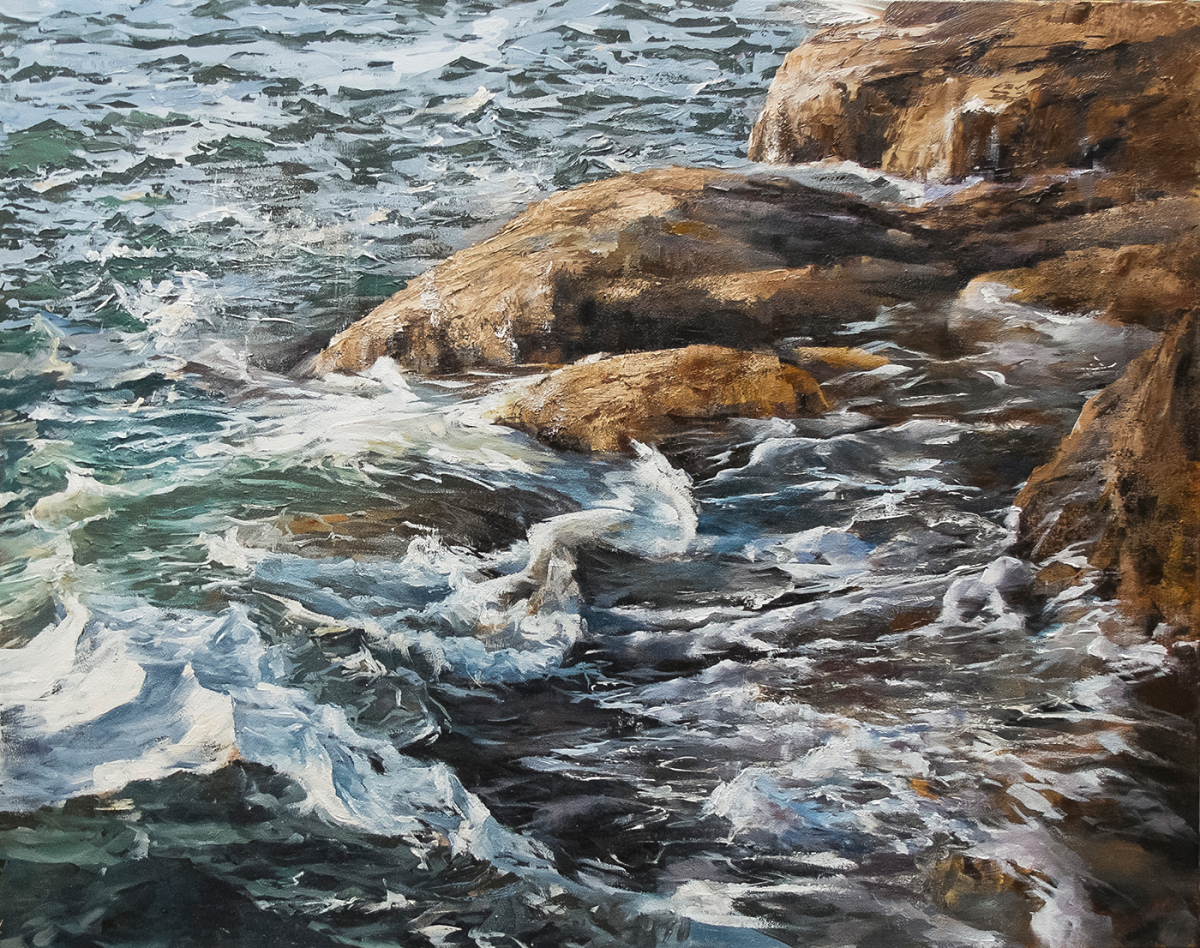 La rencontre de l'eau et de la roche - Etude du mouvement de l'eau, son clapotis et de la lumière. Peinture à l'huile © Valérie Le Merrer