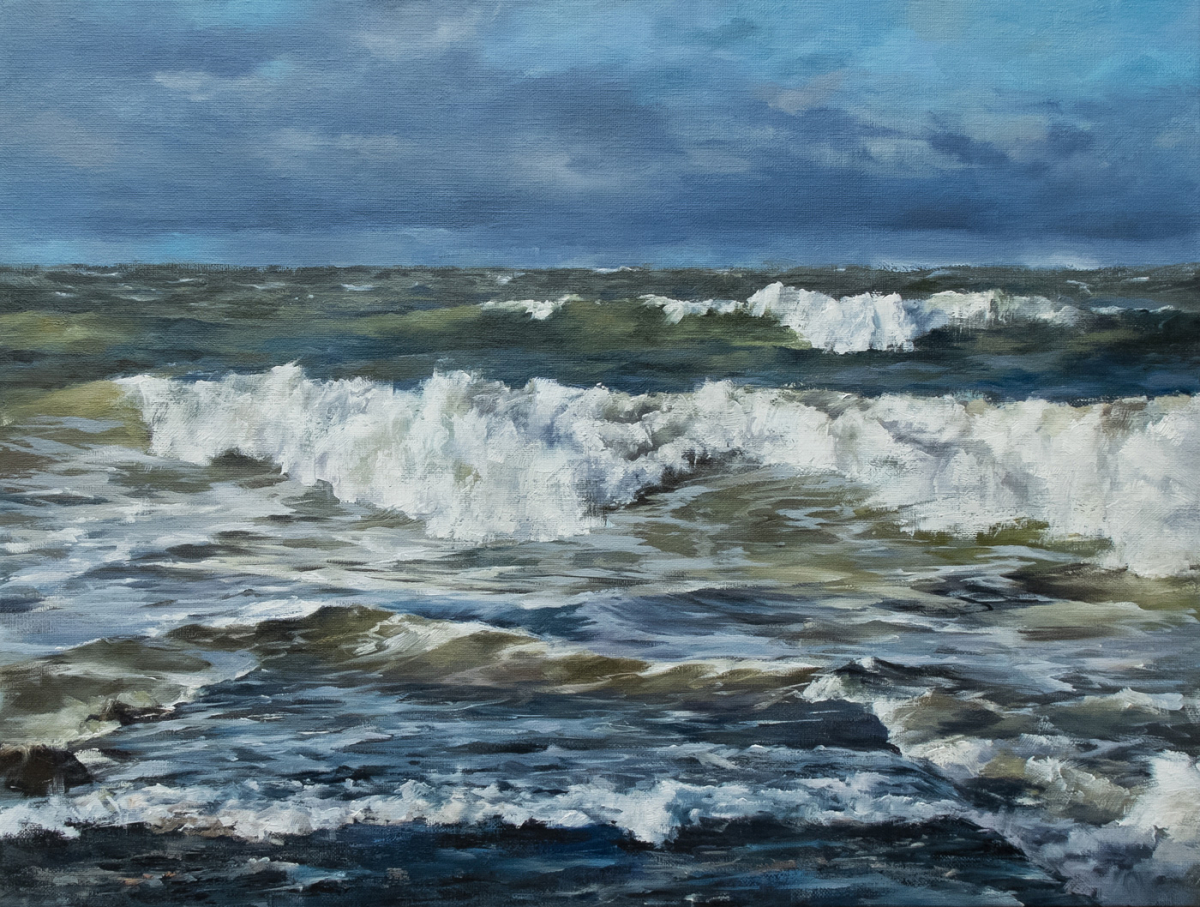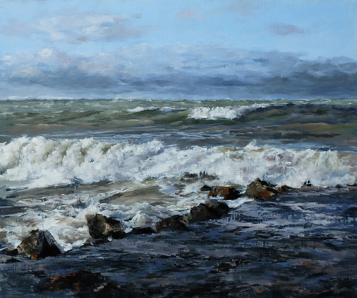Mer montante et léger clapot par temps gris. Peinture à l'huile sur toile © Valérie Le Merrer