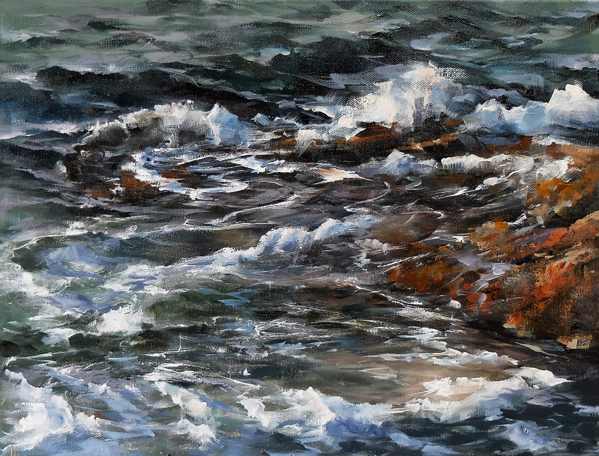 Eclats d'eau et embruns sur les roches de la grève Nord - Granville - Mixte sur toile - 35cm x 50cm © Valérie Le Merrer